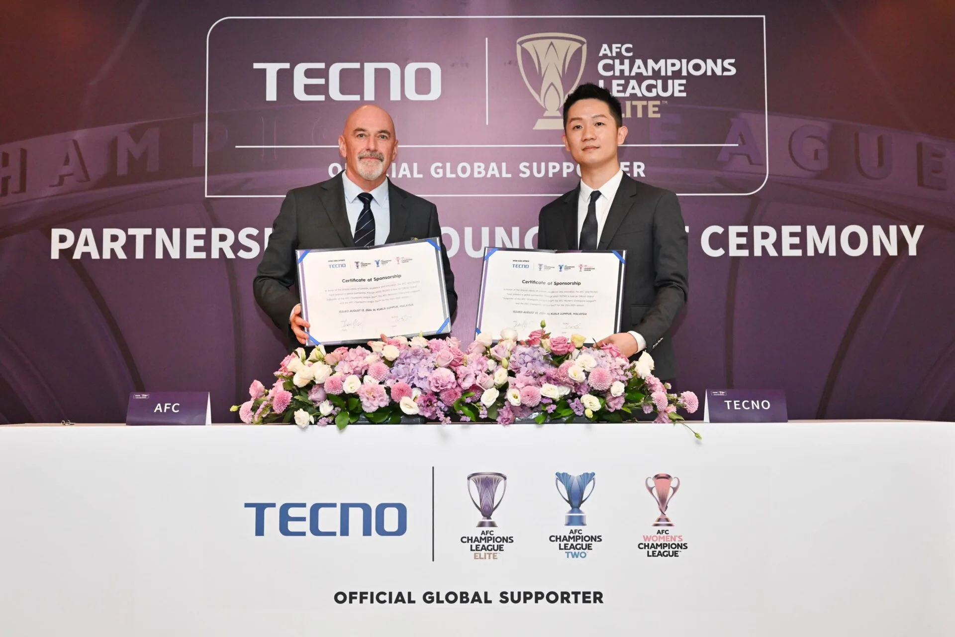 Kerjasama ini diumumkan dalam satu majlis penandatangan rasmi di Kuala Lumpur, Malaysia, dengan kehadiran wakil-wakil AFC dan eksekutif TECNO. Laury Bai, Ketua Pegawai Pemasaran TECNO, menyatakan bahawa kerjasama ini bukan hanya tentang tajaan, tetapi juga perayaan nilai bersama seperti semangat, kecemerlangan, dan inovasi. Kerjasama ini bertujuan untuk mencipta pengalaman bermakna bagi peminat bola sepak di seluruh Asia, menggabungkan teknologi dengan semangat kesukanan.