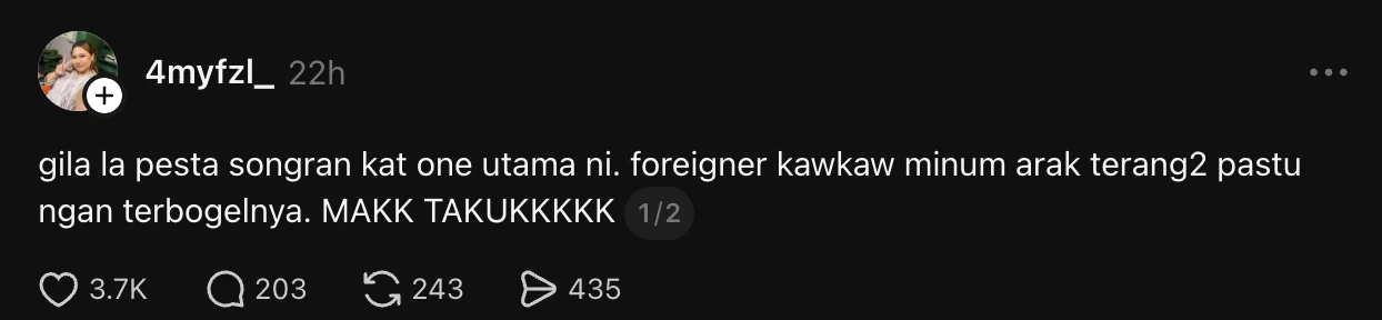“Gila la pesta songran kat one utama ni. foreigner kawkaw minum arak terang2 pastu ngan terbogelnya. MAKK TAKUKKKKK”.