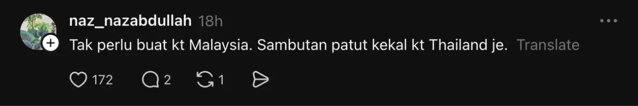 “Tak perlu buat kt Malaysia. Sambutan patut kekal kt Thailand je,” antara komen yang mencetuskan pelbagai reaksi daripada netizen lain.