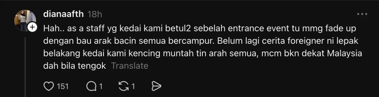 “as a staff yg kedai kami betul2 sebelah entrance event tu mmg fade up dengan bau arak bacin semua bercampur. Belum lagi cerita foreigner ni lepak belakang kedai kami kencing muntah tin arah semua, mcm bkn dekat Malaysia dah bila tengok”.