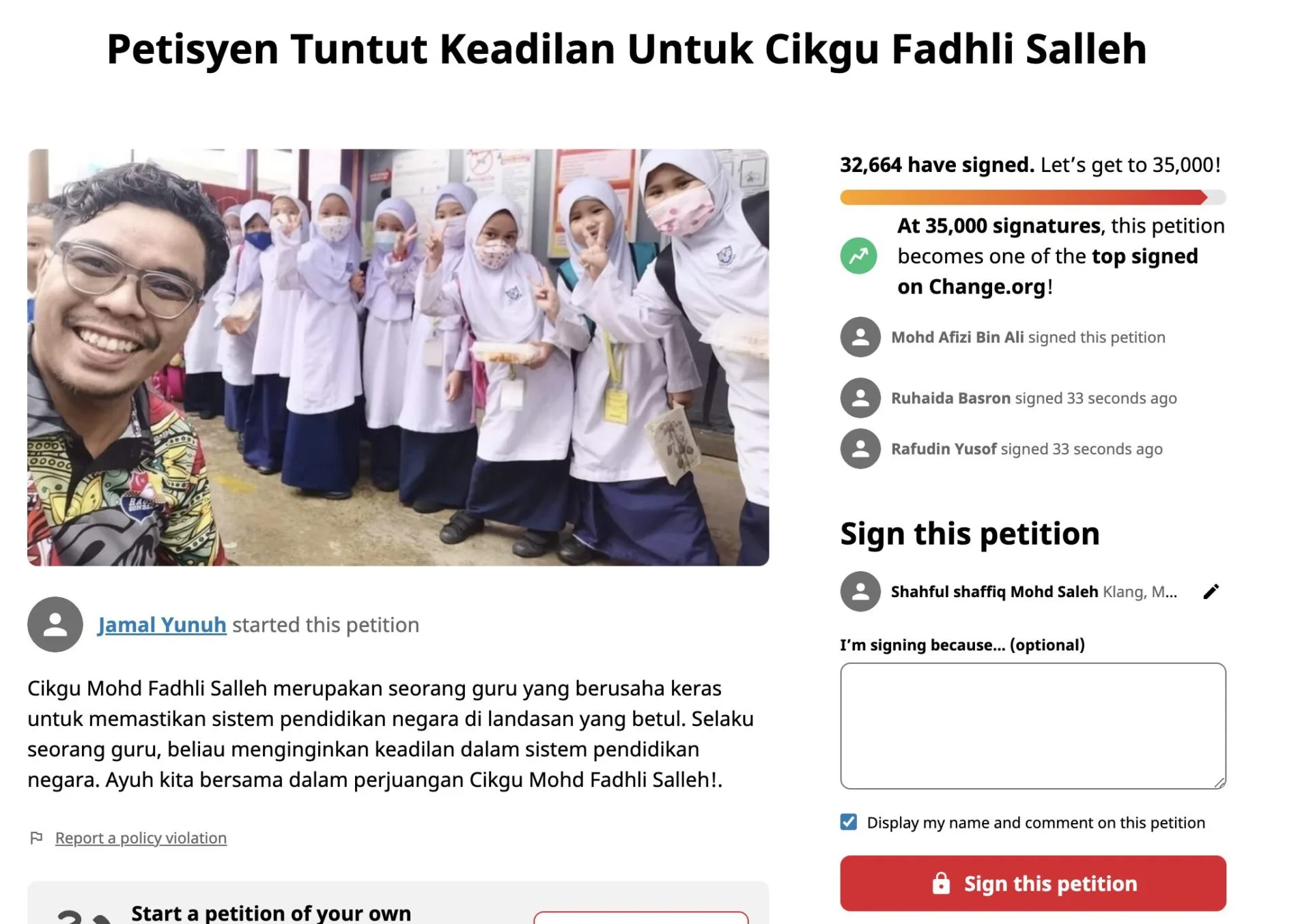 Dalam masa 2 hari sejak petisyen dibuka, lebih dari 33,000 orang ramai di negara ini menandatangani petisyen dalam talian bagi membantah tindakan tatatertib yang dikenakan ke atas seorang guru di Sekolah Kebangsaan (1) Gombak, Mohd. Fadli Salleh, setakat pukul 5 petang tadi.