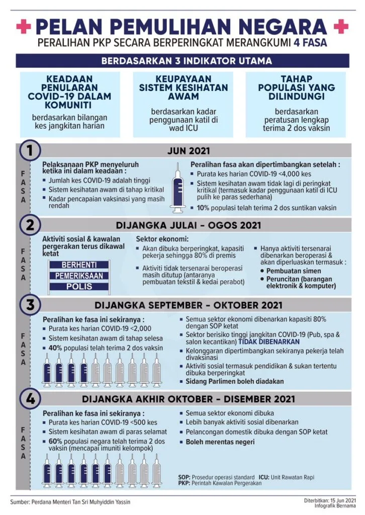 Baru-baru ini, kerajaan telah mendedahkan Strategi Pelan Pemulihan Negara ini merangkumi empat fasa dan akan melibatkan pelan peralihan fasa PKP secara berperingkat. Dalam pelan tersebut adan menyebut, semua sektor ekonomi akan dibenarkan beroperasi bermula September 2021.