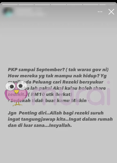 “PKP sampai September? ( tak waras kerajaan ini). Bagaimana mereka nak hidup? Yang masih ada peluang cari rezeki bersyukurlah!”- tulisnya.
