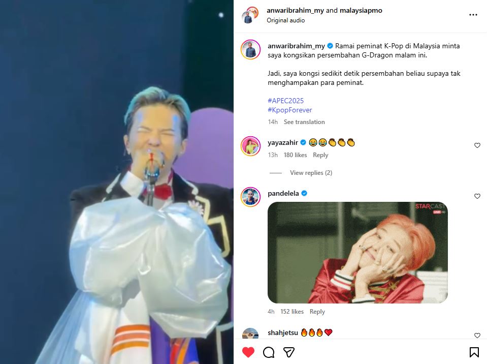 Perdana Menteri, Datuk Seri Anwar Ibrahim, mencuri perhatian warganet apabila berkongsi klip 36 saat persembahan G-Dragon pada makan malam Pemimpin-Pemimpin Ekonomi APEC malam tadi.