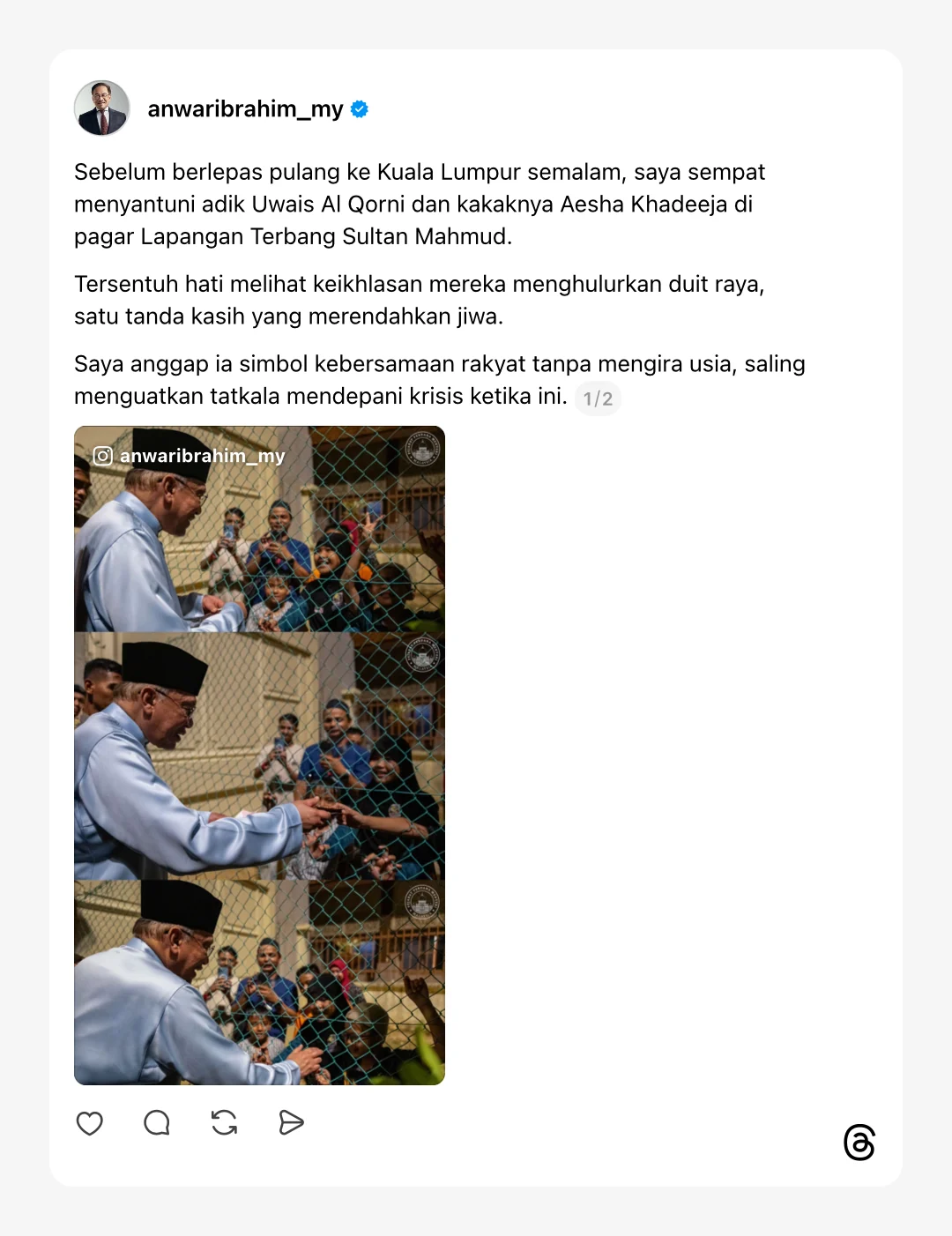 Datuk Seri Anwar Ibrahim menerusi hantaran di Thread, beliau mengakui merasa tersentuh hati melihat kanak-kanak bernama Uwais Al-Qarni dan kakaknya, Aesha Khadeeja yang menghulurkan duit raya di sebalik pagar Lapangan Terbang Sultan Mahmud.