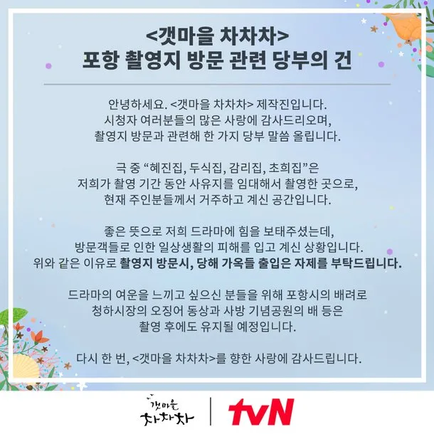“Hello. Ini adalah pasukan produksi ‘Hometown Cha-Cha-Cha’. Kami ingin mengucapkan terima kasih kepada penonton kami kerana telah memberi kami banyak kasih sayang, dan kami ingin membuat satu permintaan mengenai lawatan lokasi penggambaran kami.