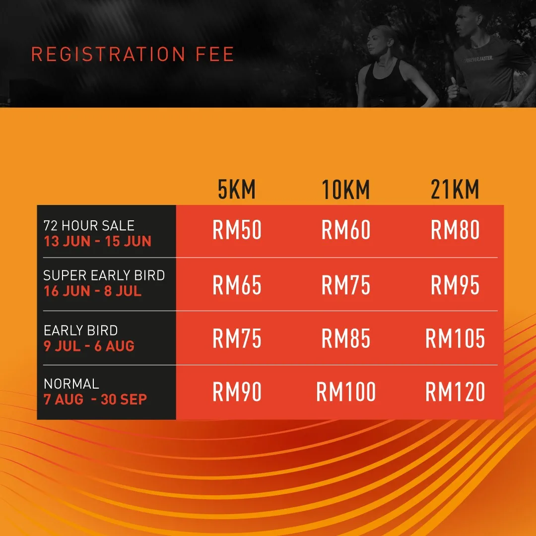 Manakala bagi peserta yang menyertai larian separuh marathon 21KM, akan menerima PUMA Performance Running Tee eksklusif, finisher medal, PUMA drawstring bag, serta Finisher Tee eksklusif setelah berjaya menghabiskan larian.