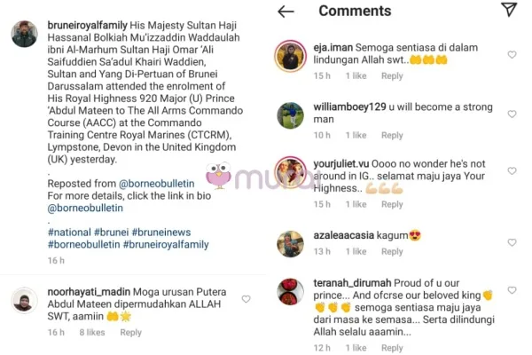 Orang ramai khususnya warga Brunei meluahkan rasa kagum melihat Putera Mateen, menerusi foto yang dimuatnaik di Instagram keluarga diraja itu mereka dapat melihat kecekalan serta karisma Putera Mateen ketika menjalani latihan di pusat latihan komando.