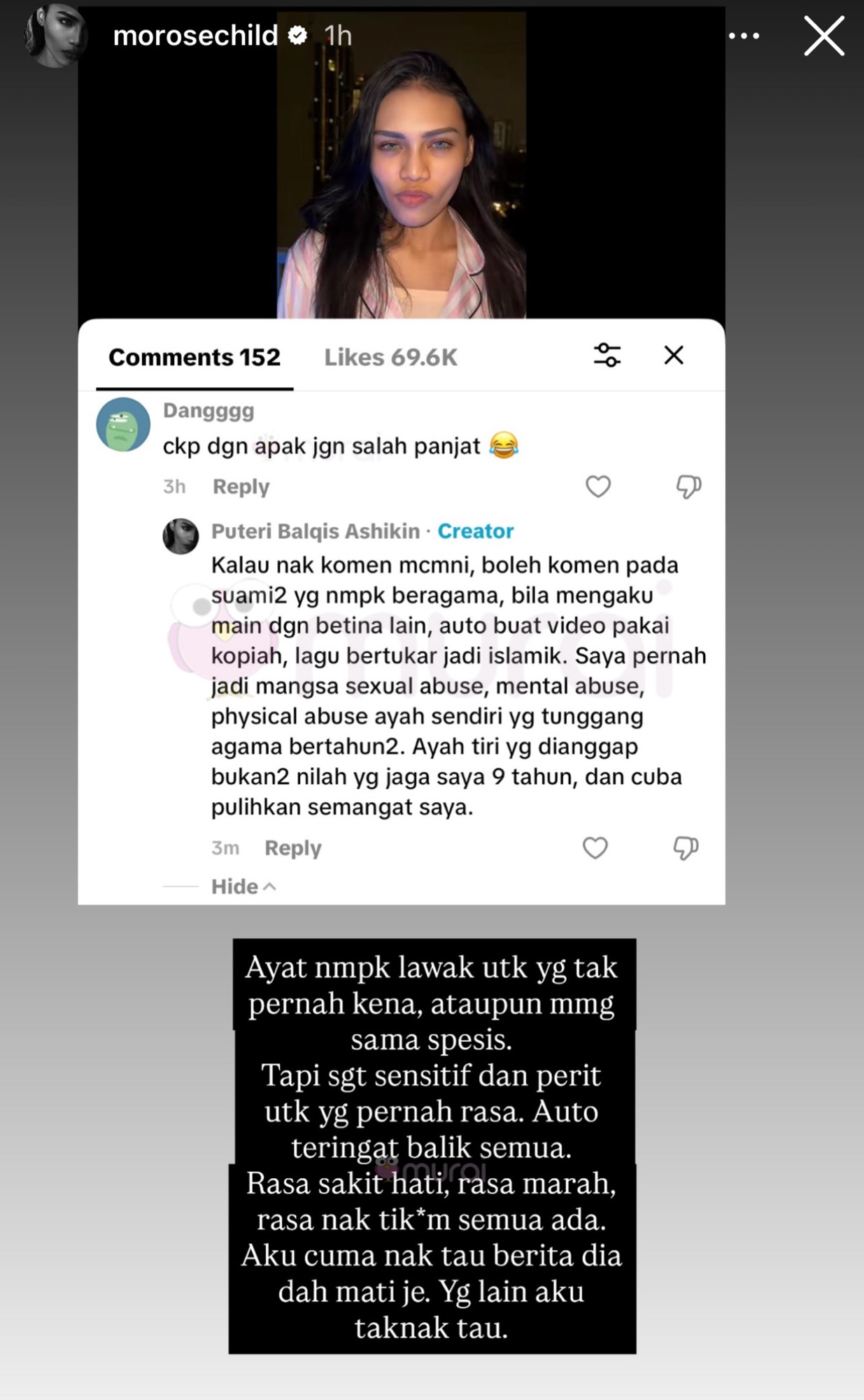 Tidak berdiam diri, pelakon berusia 18 tahun ini tampil membidas komen netizen tersebut dengan menegaskan bahawa bapa tirinya itulah yang menjaganya selama sembilan tahun selepas menjadi mangsa penderaan sek*ual, mental, dan fizikal oleh bapa kandung sendiri.
