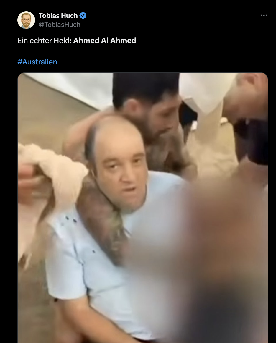 Tindakan spontan Ahmed menerima pujian meluas. Premier New South Wales, Chris Minns, menyifatkannya sebagai “wira sebenar” dan berkata ramai yang masih hidup hari ini hasil keberanian luar biasa itu. Perdana Menteri Australia, Anthony Albanese turut memuji individu yang “berlari ke arah bahaya demi menyelamatkan orang lain”.