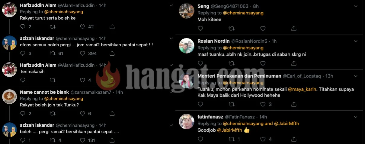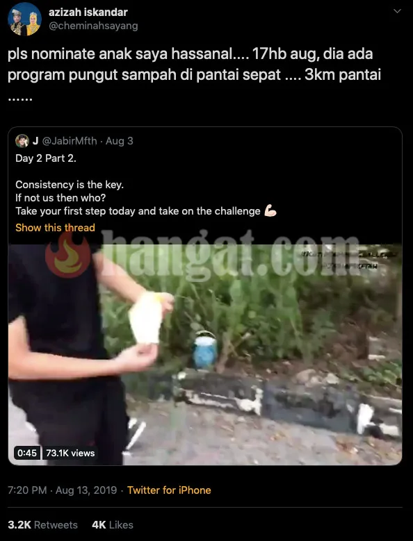 Menerusi laman Twitter Baginda, Tunku Azizah memberitahu secara kebetulan pada 17 Ogos ini, anakanda baginda yang juga Pemangku Sultan Pahang, Tengku Hassanal Ibrahim Alam Shah akan berangkat ke Pantai Sepat, Kuantan Pahang untuk turut serta dalam kempen membersihkan pantai.