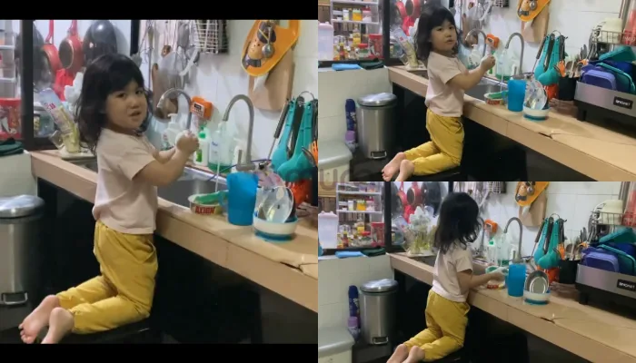 Ozlynn memuatnaik rakaman video anak perempuannya, Nur Latifah Moleiq Hanania sedang mencuci pinggan dan cawan dengan penuh fokus.