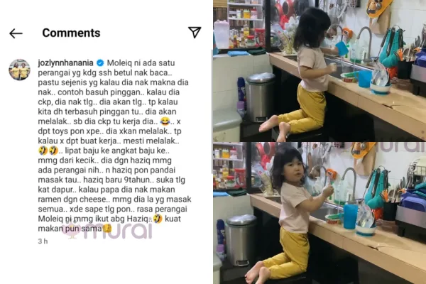 Melihat aksi anak perempuan Ozlynn dan Johan begitu fokus membasuh pinggan dan cawan sambil menyanyi ria, membuatkan ramai rakan selebriti dan juga warganet membanjiri ruangan komen muatnaik tersebut.