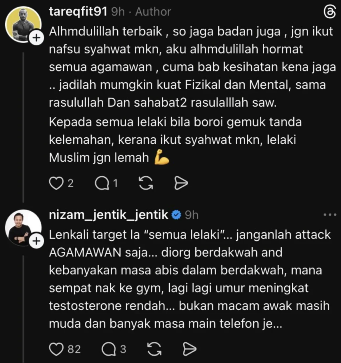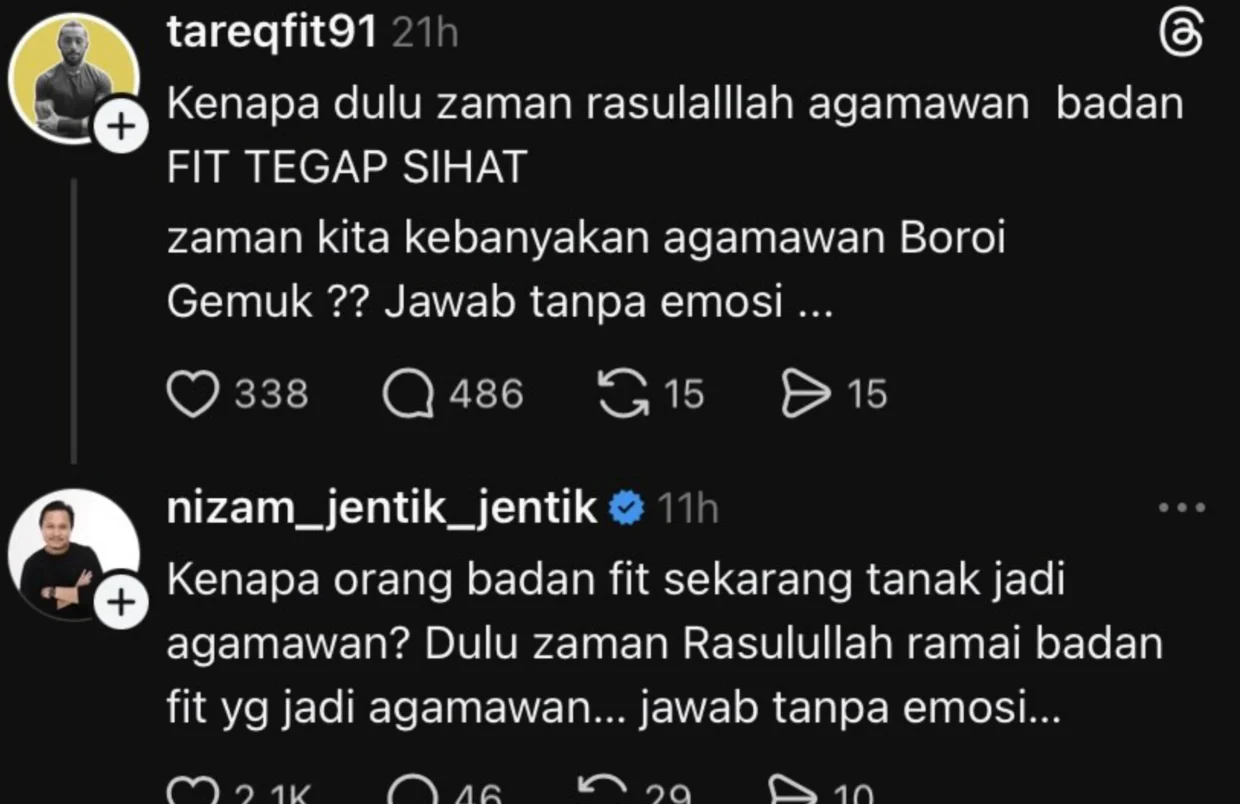 “Kenapa orang badan fit sekarang tak nak jadi agamawan? Dulu zaman Rasulullah ramai badan fit yang jadi agamawan… jawab tanpa emosi,” balasnya.