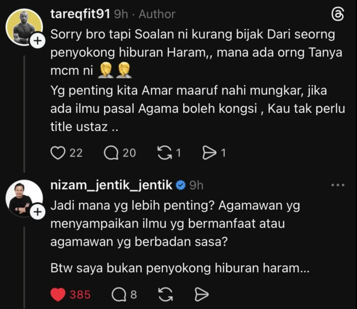 “Yang penting menjadi Muslim mukmin berdakwah. Dua-dua penting badan dan ilmu. Aku kata penyokong hiburan haram bila check profile kau,” tulisnya lagi.