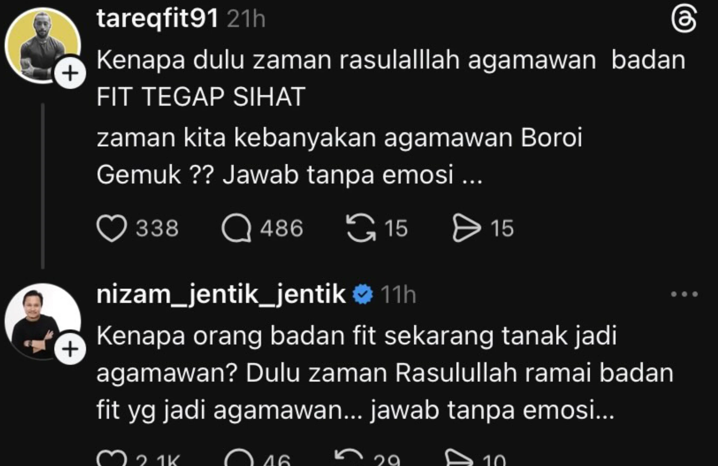 “Kenapa orang badan fit sekarang tak nak jadi agamawan? Dulu zaman Rasulullah ramai badan fit yang jadi agamawan… jawab tanpa emosi,” balasnya.