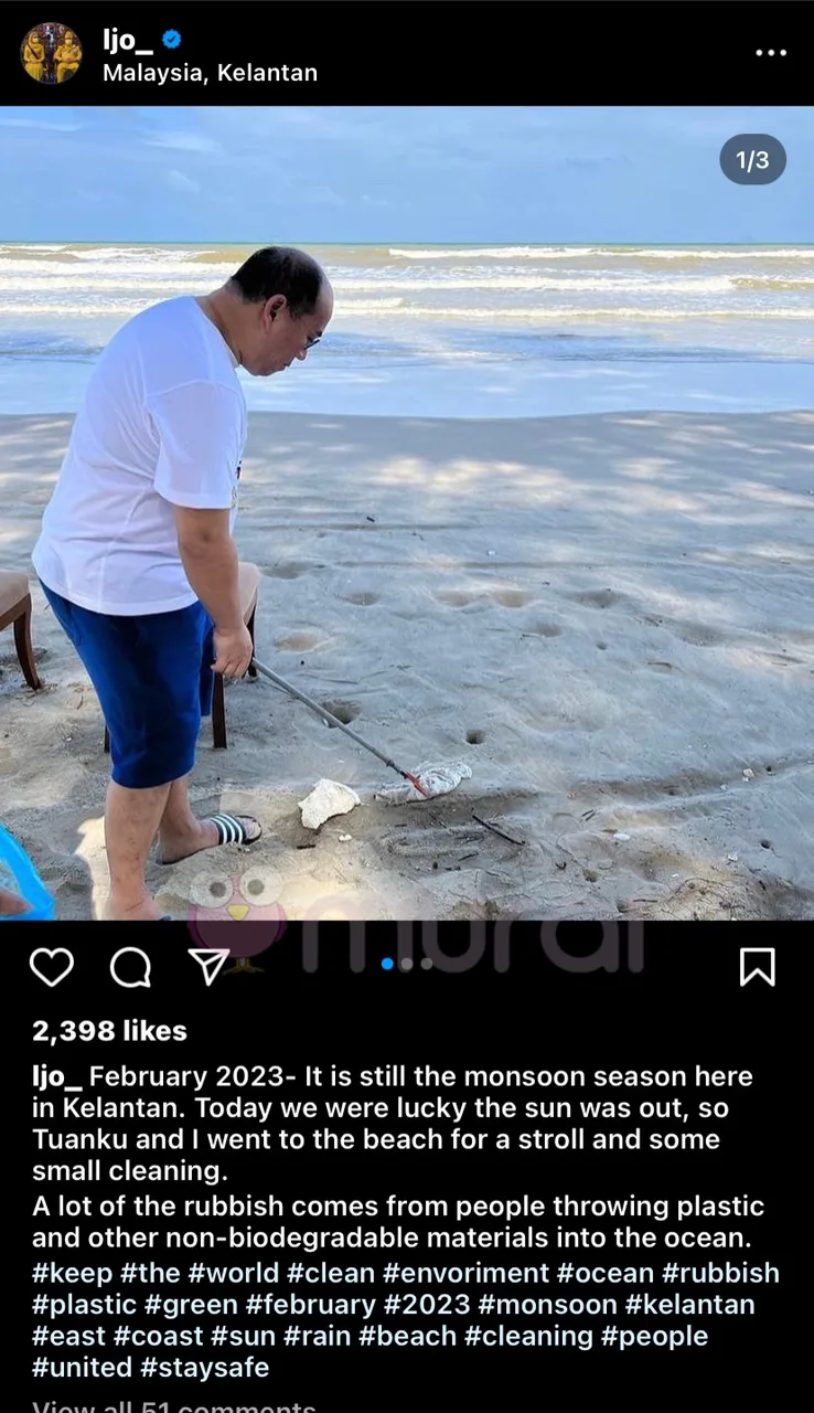 Menerusi perkongsian dari media sosial milik isteri kerabat diraja Kelantan itu, Cik Puan Sofie Louise mengambil inisiatif untuk membersihkan sekitar pantai bersama-sama suaminya Tengku Muhammad Fa-iz Petra ibni Almarhum Sultan Ismail Petra.