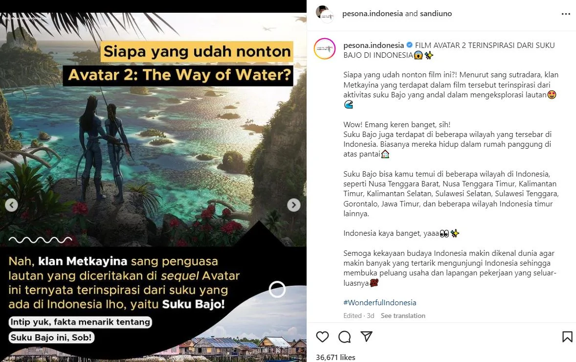 Sandiaga Uno selaku Kementerian Pariwisata dan Ekonomi Kreatif Republik Indonesia berkongsi fakta tentang keindahan alam dan suku kaum di Indonesia yang menjadi inspirasi pengarah filem kedua Avatar itu.