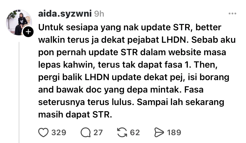 Ketiga, semak status permohonan secara berkala melalui portal MySTR atau hubungi talian bantuan LHDNM di 1-800-88-2747. Jika permohonan ditolak, anda boleh mengemukakan rayuan dengan menyertakan dokumen sokongan tambahan.