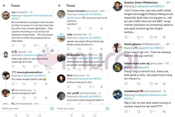 “Rasa sedih sebab tengok bersungguh-sungguh rakyat Malaysia lari terutama akak baju kelabu tu. Nak lari dari trafik, kena lari dekat MRT. Harap menteri berkaitan buat sesuatu sebelum ada apa insiden yang tak diingini berlaku.”
