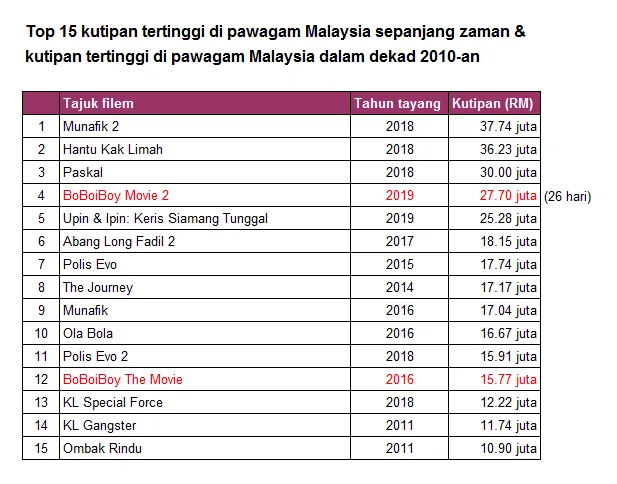 - Filem animasi paling laris di Malaysia sepanjang zaman (merangkumi filem animasi tempatan & luar negara)