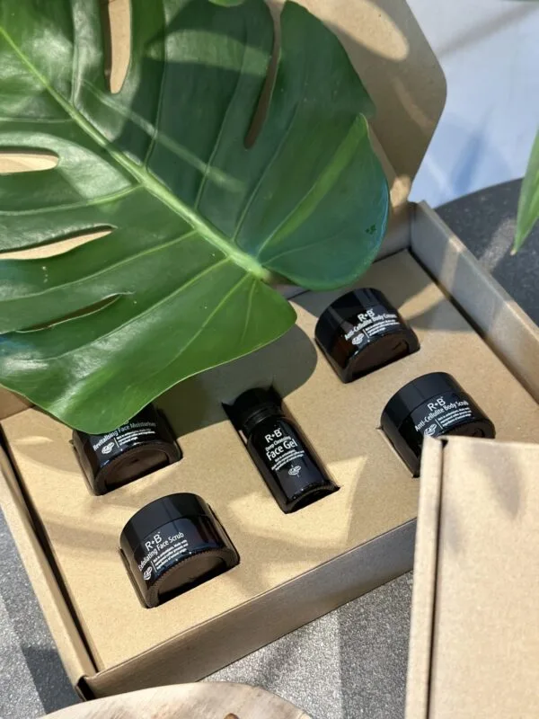 Koleksi R+B menampilkan lima produk untuk rutin penjagaan kulit harian. Ini termasuk Gel Muka Pembersih Mendalam, Skrub Muka Pengelupasan, Pelembap Wajah yang Menghidupkan Semula Kulit, Skrub Badan Anti Selulit dan Krim Badan Anti Selulit.