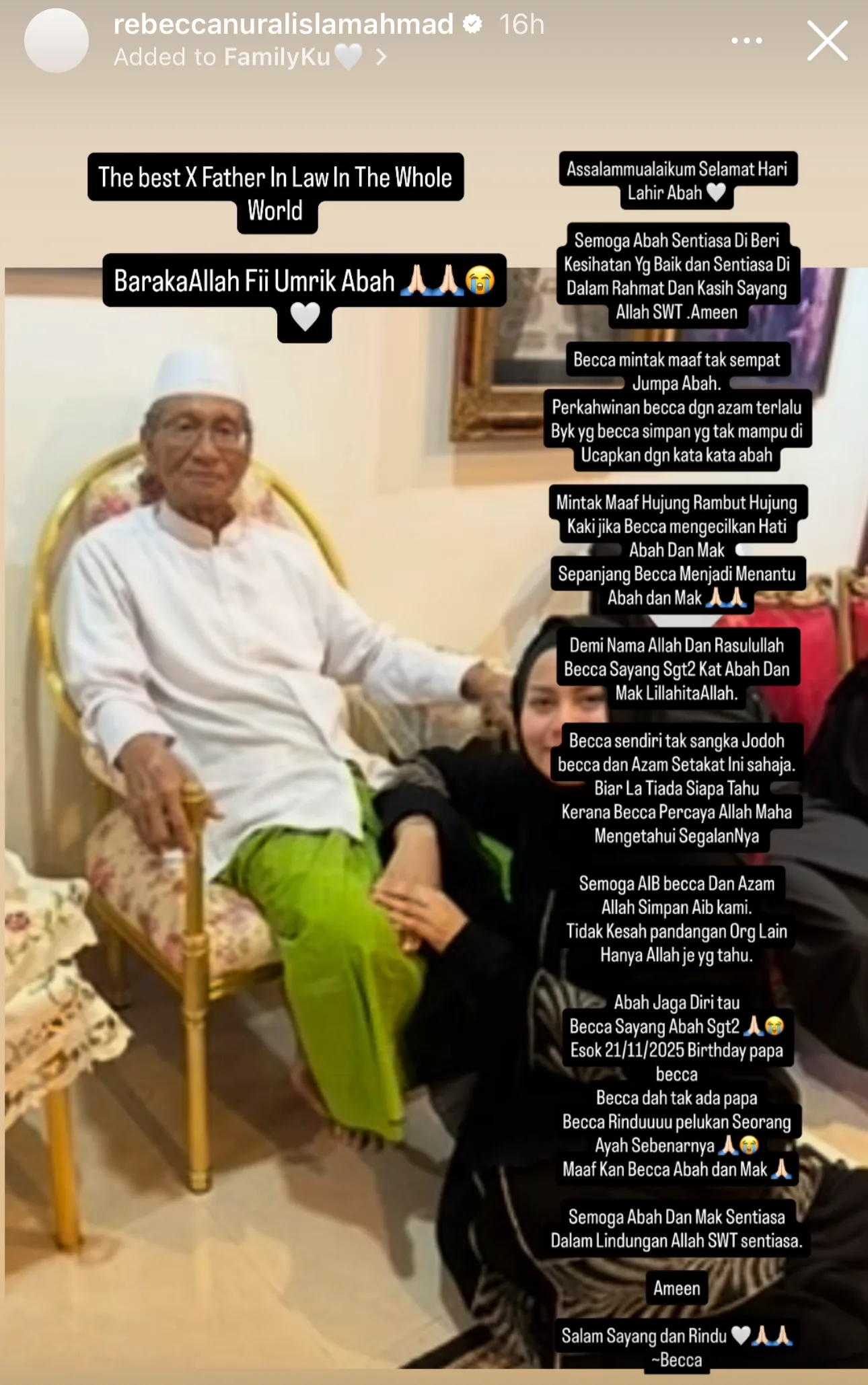 Rebecca atau nama penuhnya Rebecca Nur Al-Islam Ahmad menerusi hantaran di Instagram turut memohon maaf buat bekas bapa mentuanya sepanjang dia masih bergelar menantu selepas berpisah dengan suaminya, Azam pada Oktober lalu.