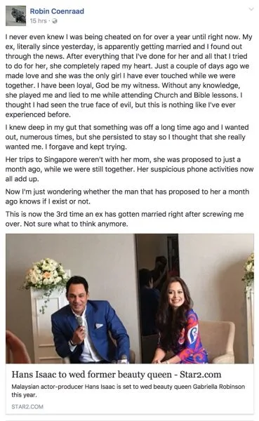 Baru sahaja mengumumkan tarikh perkahwinan semalam, Hans Isaac dan bakal isterinya Gabriella dilanda kontroversi yang melibatkan bekas teman lelaki Gabriella. Melalui laman Facebook lelaki bernama Robin Coenraard ini meluahkan isi hati dan dikatakan masih bersama dengan Gabriella ketika Hans melamar wanita itu sebulan lalu.