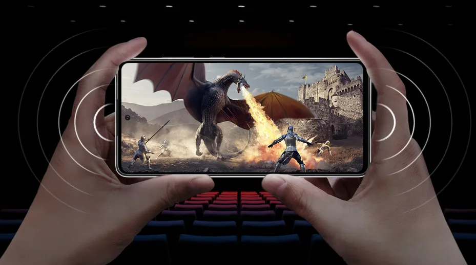 Tetapi, anda tidak perlu risau kerana Galaxy A72 dilengkapi dengan dua pembesar suara, satu di atas dan satu di bawah. Anda boleh mendapatkan pengalaman audio stereo tanpa fon telinga. Nikmati menonton filem atau permainan kegemaran anda dengan suara sinematik yang akan membolehkan anda merasai pengalaman seperti menonton wayang.