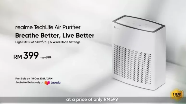 Realme TechLife Air Purifier dijual pada harga RM499 dengan satu pilihan warna iaitu Pure White. Namun begitu, anda masih boleh membelinya dengan harga promosi lebih murah iaitu RM399 pada jualan pertamanya yang berlangsung pada 18 Oktober 2021. Ketersediaan adalah eksklusif di Lazada.