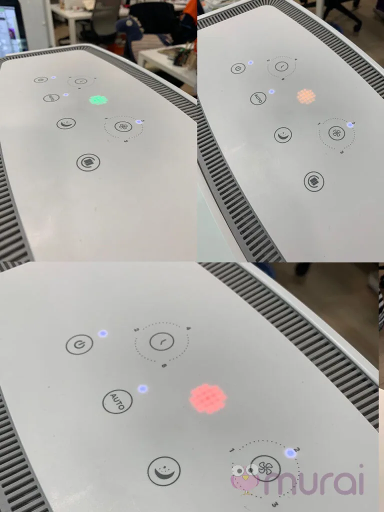 Pembersih udara dilengkapi dengan monitor kualiti udara masa nyata dengan penunjuk cahaya yang menunjukkan hijau untuk kualiti udara yang baik, oren untuk kualiti udara sederhana, dan merah untuk kualiti udara yang buruk.