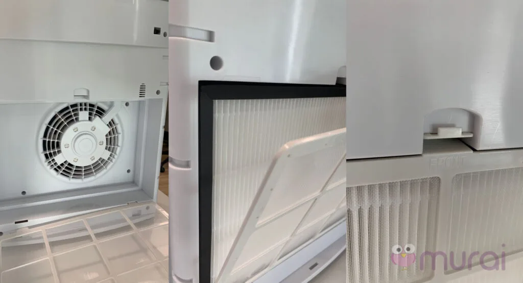 Panel depan boleh dilbuka dengan menekan pada bahagian atasnya. Di sini, anda akan mendapat akses ke penapis HEPA dan penapis pra.