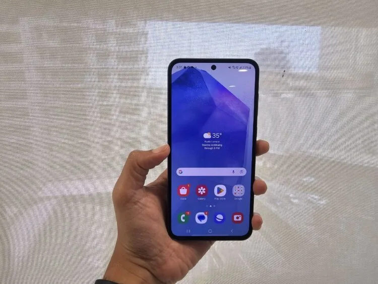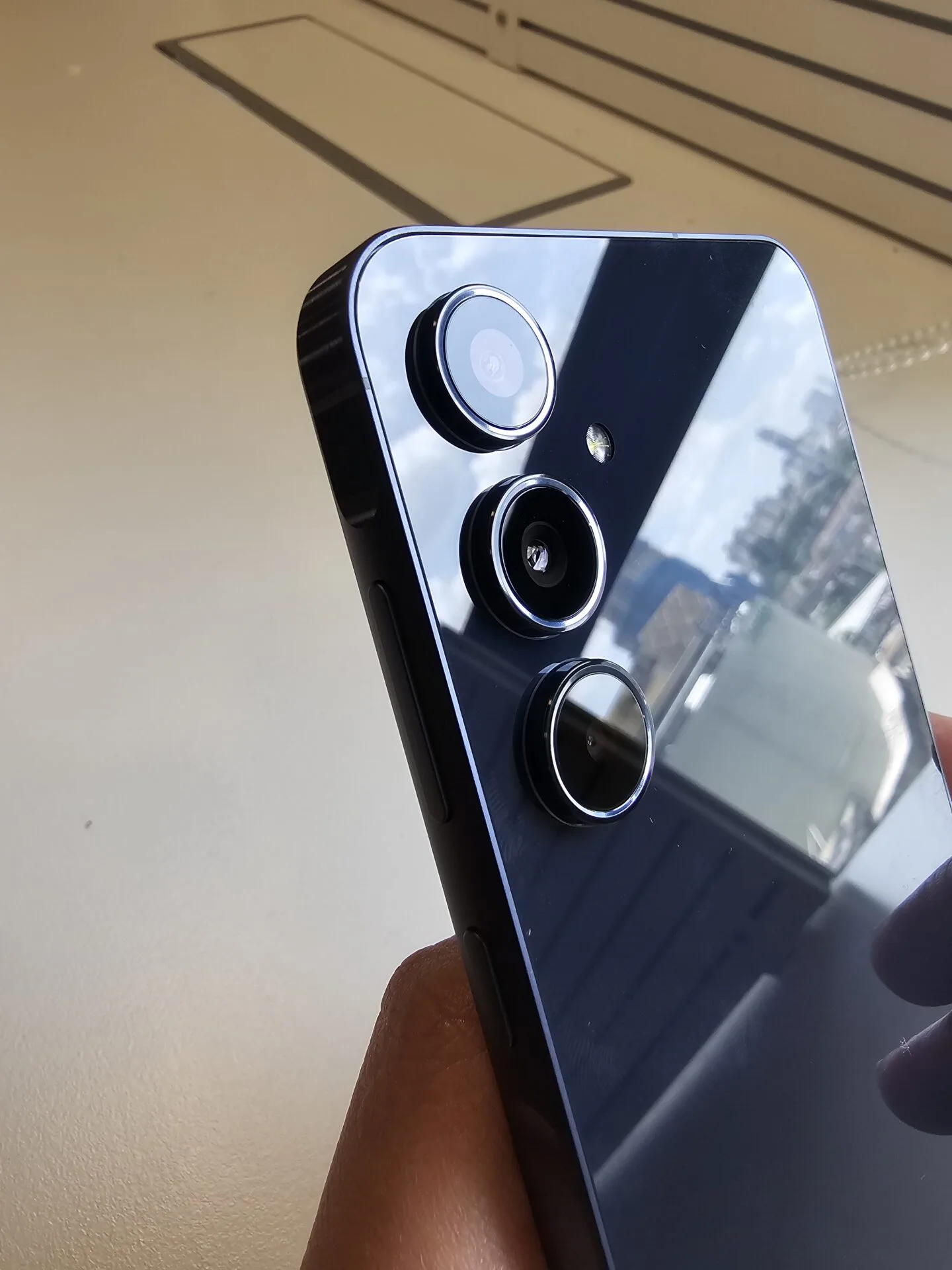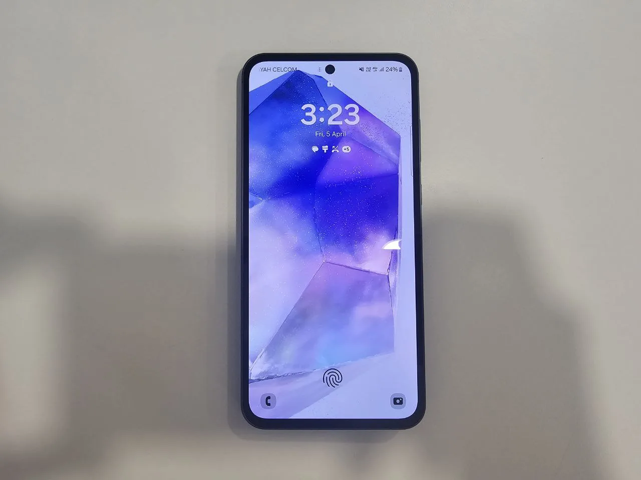 Sekali pandang orang akan menyangka ini adalah Galaxy S24, yang merupakan siri perdana terbaru daripada Samsung. Persamaan A55 dengan Samsung S24 lebih jelas dalam penempatan tiga kamera belakang yang menonjol dengan denyar di sebelah kanan.