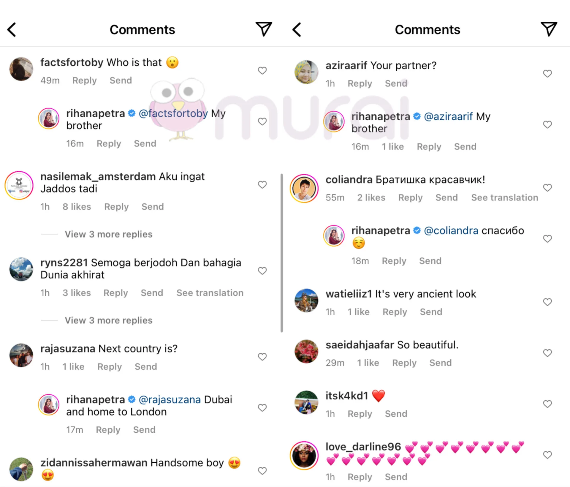 Kekal tenang, Rihana dilihat membalas beberapa komen netizen dengan menjelaskan bahawa jejaka yang turut bercuti bersamanya di Arab Saudi itu merupakan adik lelakinya, Ivan.