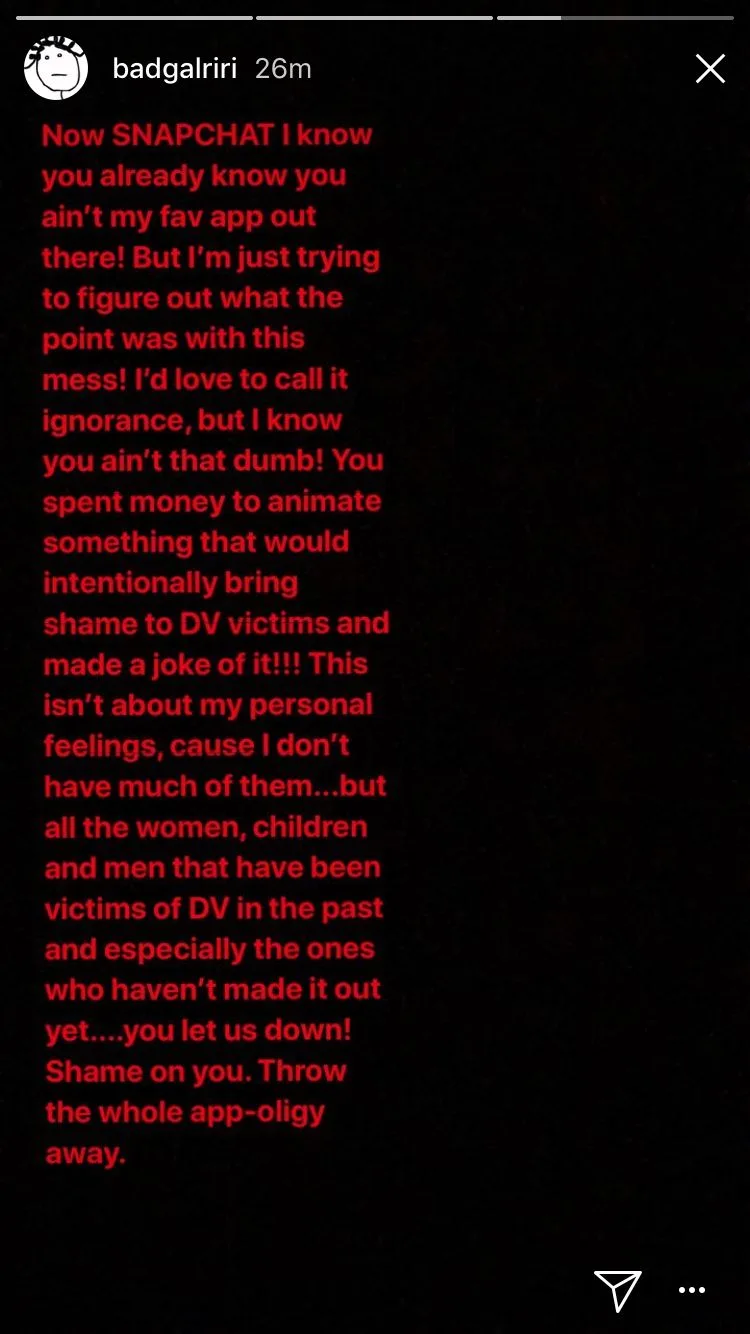 Syarikat terbabit menarik balik iklan itu dan meminta maaf tetapi Rihanna menggunakan saingan Snapchat, Instagram untuk mengecam syarikat itu. Pengaruh Rihanna dalam industri mengakibatkan saham dalam syarikat induk Snapchat, Snap Inc, jatuh 3.64 peratus pada hari stabil di Wall Street.