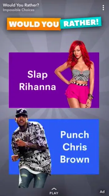 Penyanyi seksi Rihanna, semalam mengecam aplikasi Snapchat selepas aplikasi tersebut menyiarkan iklan yang menyinggung perasaan Rihanna dengan memaparkan permainan yang meminta pengguna memilih sama ada ingin menampar Rihanna atau menumbuk bekas teman lelaki Rihanna iaitu Chris Brown?  Tindakan bintang pop berkenaan menyebabkan harga saham syarikat itu jatuh secara merudum.