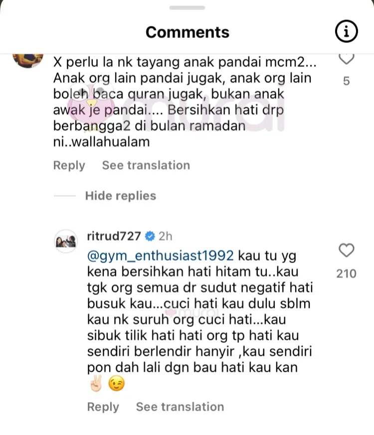 Tidak berdiam diri, Rita dilihat membalas komen netizen berkenaan dengan memintanya untuk membersihkan hati daripada memandang setiap perkara dari sudut yang negatif.