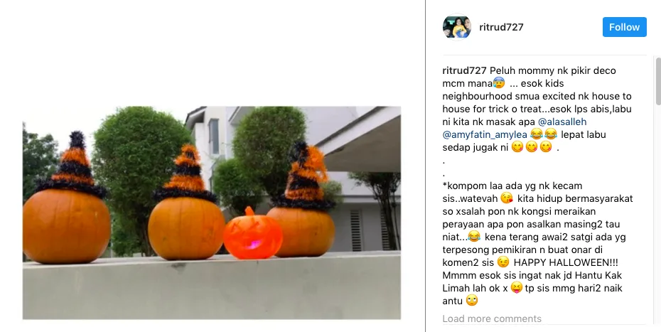 Namun menurut pelakon ini, niatnya bukanlah mahu meraikan perayaan tersebut, sebaliknya hanya mahu berseronok bersama anak-anak jiran yang meraikan perayaan Halloween.