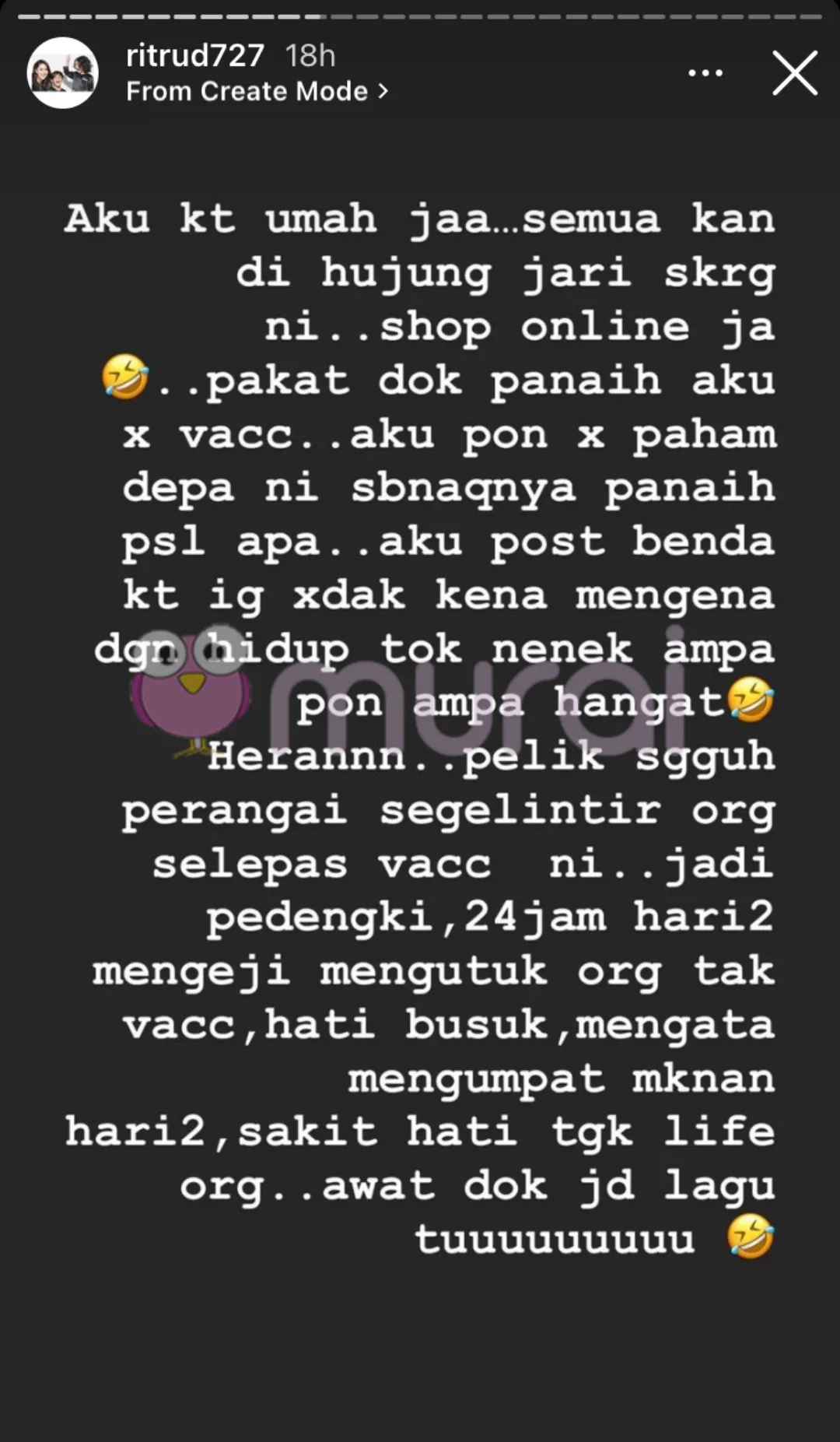 “Aku kat umah jaa…semua kan di hujung jari sekarang ni..shop online ja. Pakat dok panaih aku tak vaksin. Aku pun tak faham depa ni sebenaqnya panaih pasal apa. Aku post benda kat IG takdak kena mengena dengan hidup tok nenek hampa pun hampa hangat.