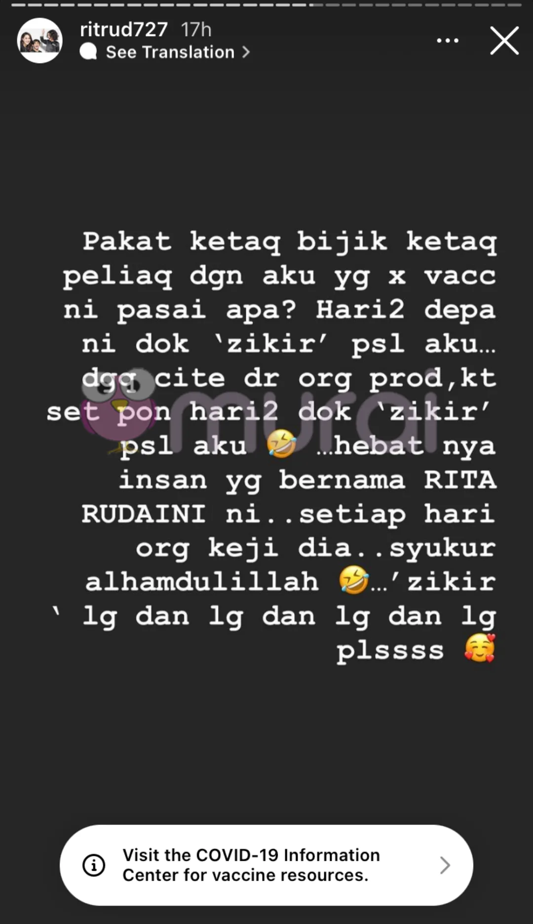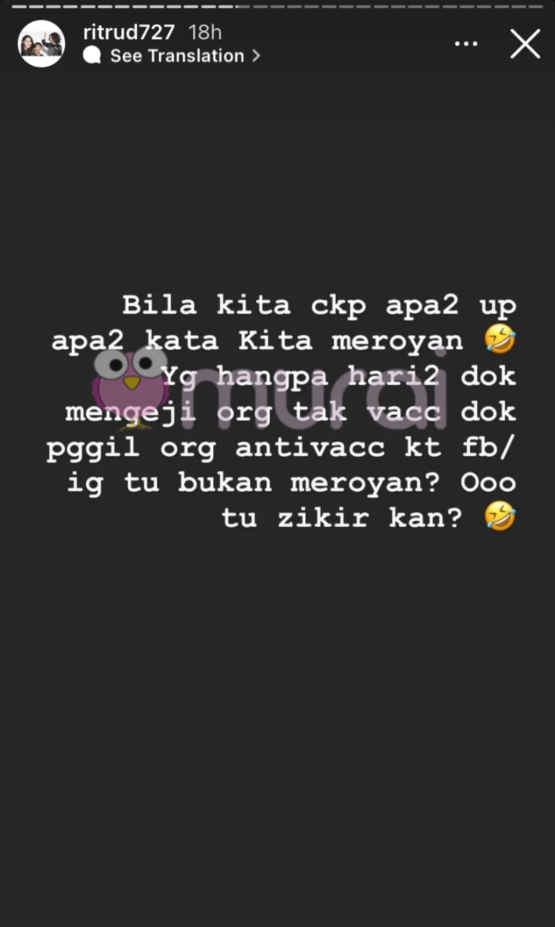 “Bila kita cakap apa-apa, up apa-apa kata kita meroyan. Yang hangpa hari-hari dok mengeji orang tak vaksin dok panggil orang antivacc kat fb/ig tu bukan meroyan? Ooo tu zikir kan?- ujar Rita