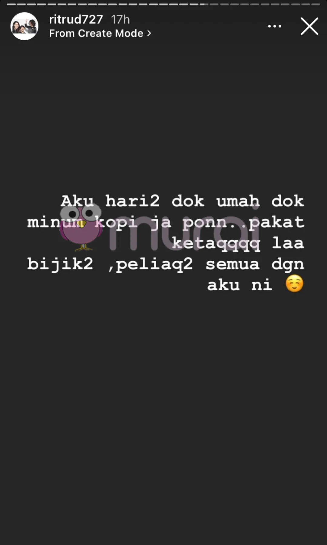 “Aku hari-hari dok rumah dok minum kopi ja pon,.Pakat ketaq la bi**k2, pe**aq semua dengan aku ni”- katanya