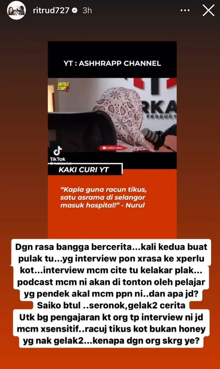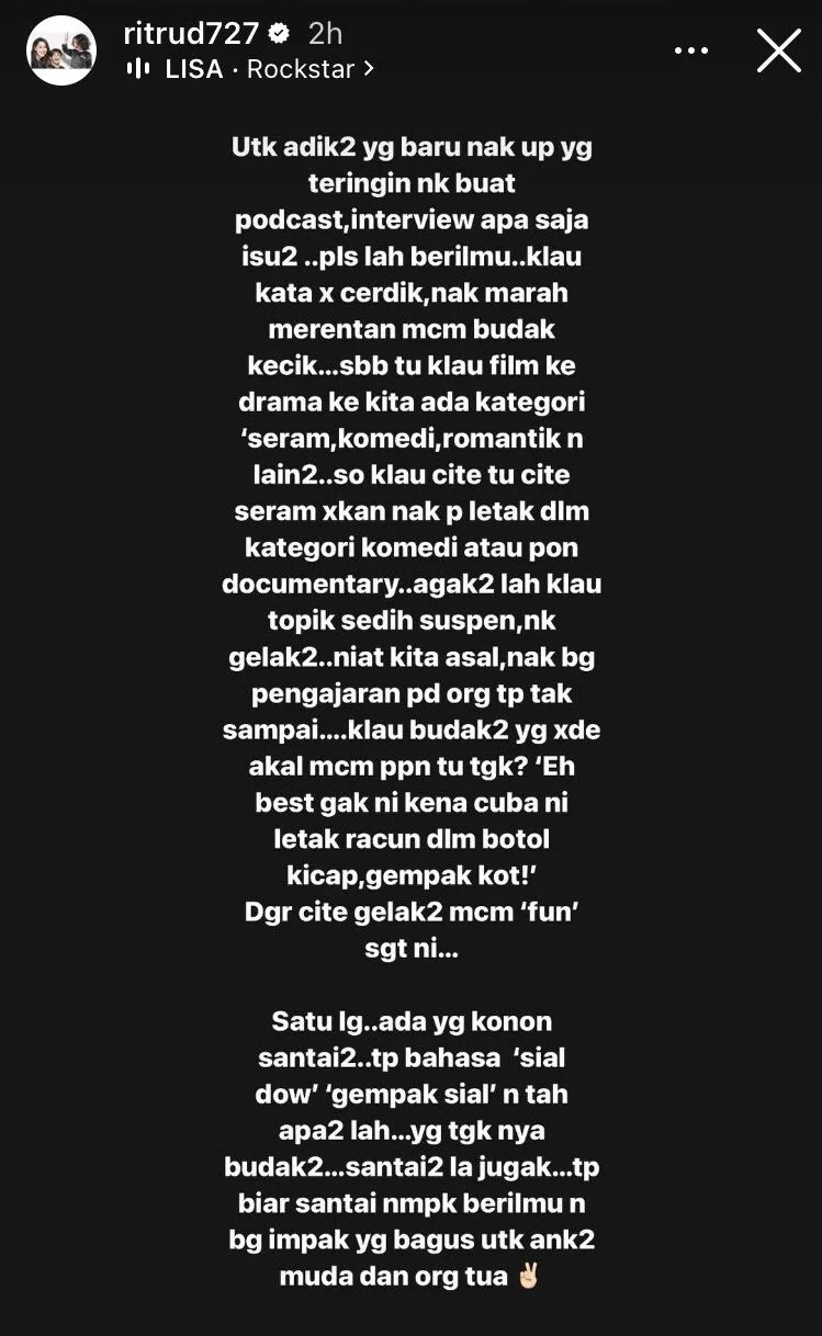 Podcast macam ni akan ditonton oleh pelajar yang pendek akal macam perempuan ni. Dan apa jadi? Psiko betul, seronok, gelak-gelak cerita. Untuk bagi pengajaran kat orang tapi interview ni jadi macam tak sensitif. Racun tikus kot bukan honey yang nak gelak-gelak. Kenapa dengan orang sekarang ya.”-kesal Rita di Instagram
