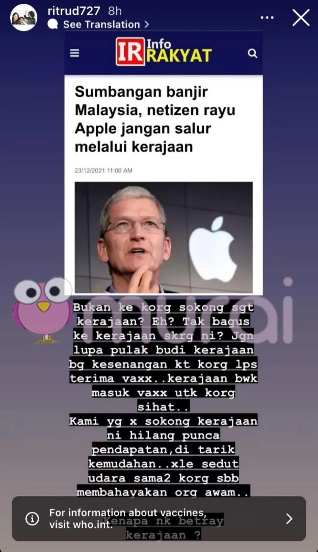 Pelakon, Rita Rudaini tampil mempersoalkan tindakan netizen yang tidak membenarkan Ketua Pegawai Eksekutif Apple, Tim Cook untuk menghantar sumbangan dan bantuan kepada mangsa banjir di Malaysia melalui kerajaan.