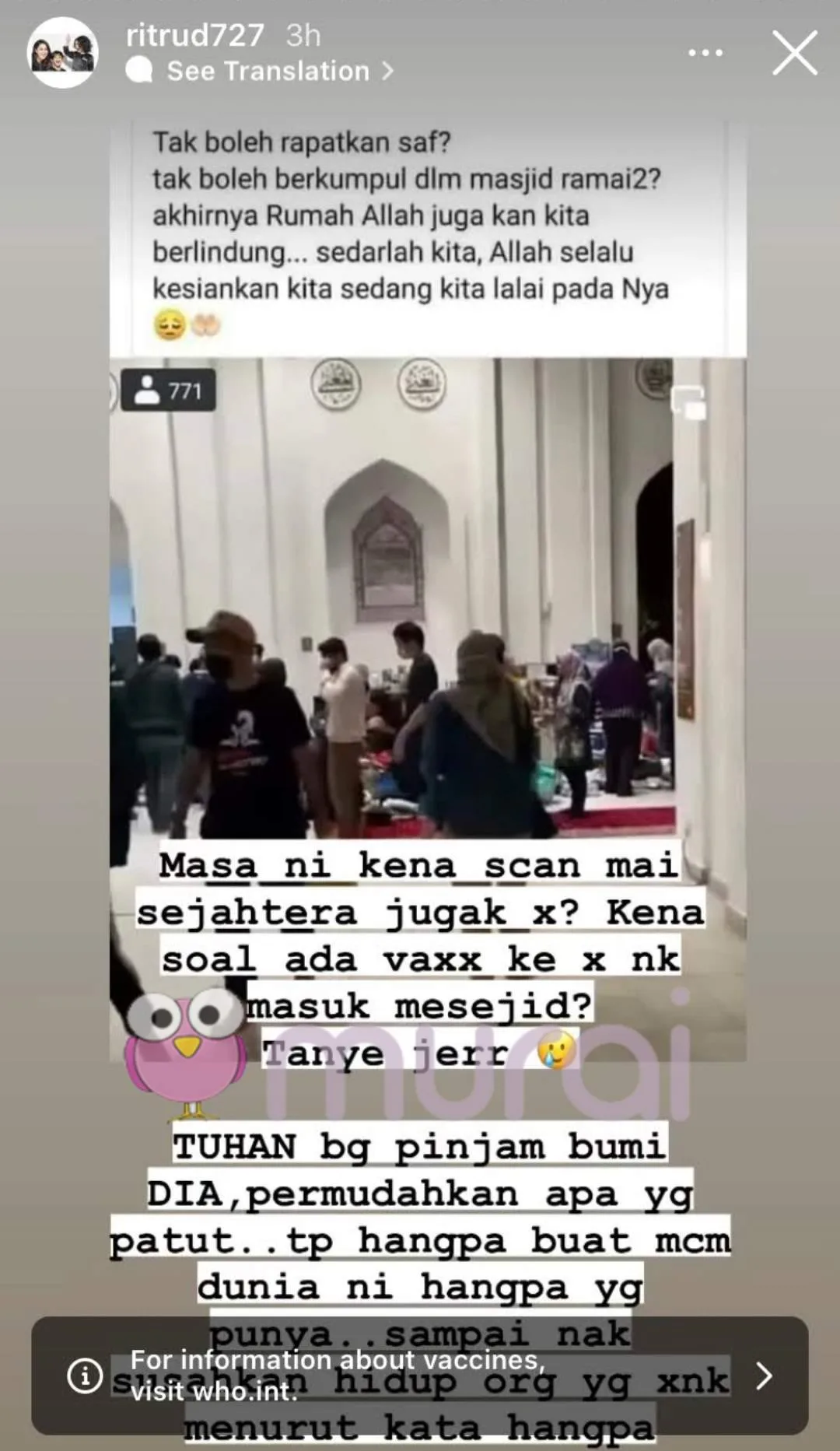 “Masa ni kena scan My Sejahtera jugak tak? Kena soal ada vaksin ke taknak vaksin masuk masjid? Tanye jerrr.”-Soal Rita