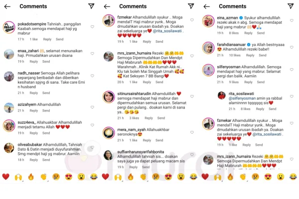 Muatnaik dikongsikan usahawan kosmetik itu mendapat banyak komen daripada kenalan rapat dan juga warganet, rata-rata mereka mendoakan agar Rita dan suaminya mendapat haji yang mabrur.