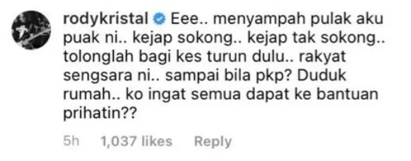 “Kau ingat semua dapat ke bantuan prihatin? Korang sedap je, duit cukup, semua cukup. Sampai bila ni nak PKP?”, dedah Rody.