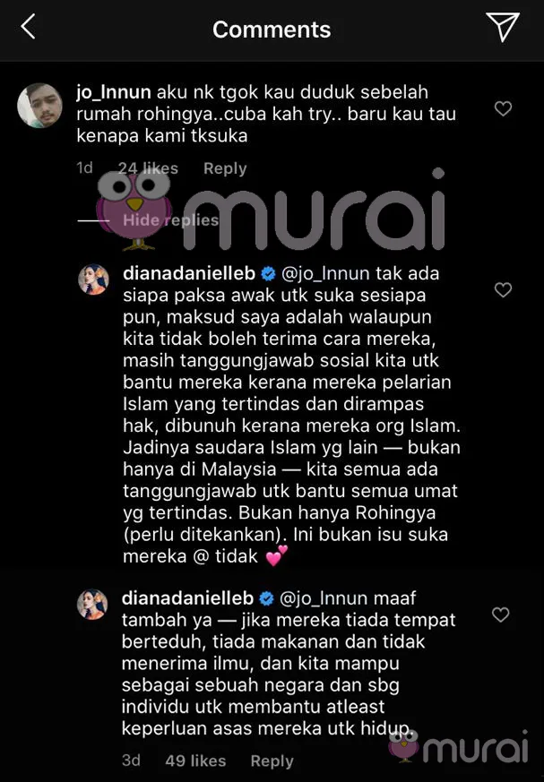 Di dalam sebuah posting di akaun Instagram, salah seorang netizen telah meninggal komen tidak berpuas hati terhadap kenyataan Diana. Padahal gambar yang dimuatnaik oleh Diana tiada kena-mengena dengan isu pelarian Rohingya.
