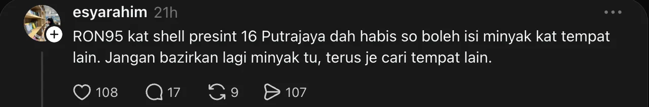 “RON95 kat Shell Presint 16 dah habis, so boleh isi minyak kat tempat lain. Jangan bazirkan lagi minyak tu, terus je cari tempat lain.”