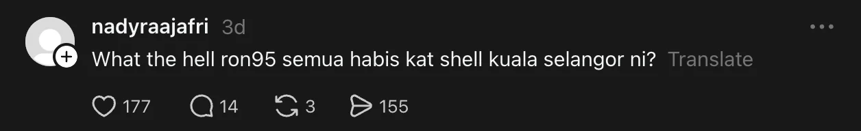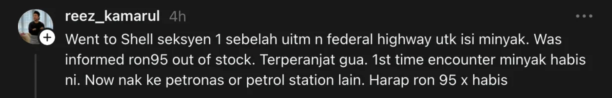 “Went to Shell Seksyen 1 sebelah UiTM dan Federal Highway untuk isi minyak. Was informed RON95 out of stock. Terperanjat gua. 1st time encounter minyak habis ni. Now nak ke Petronas atau stesen lain. Harap RON95 tak habis,” tulis seorang pengguna.
