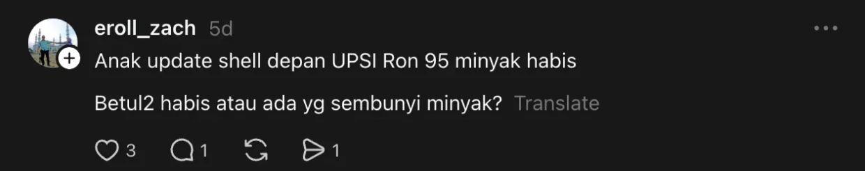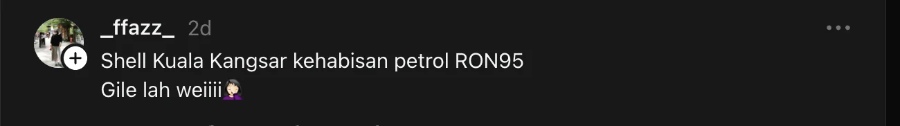 MURAI perasan sejak kebelakangan ini, ruangan Threads mula dipenuhi dengan luahan pengguna jalan raya yang berkongsi pengalaman sama, RON95 tiba-tiba “hilang” dari beberapa stesen minyak, terutamanya di Shell.